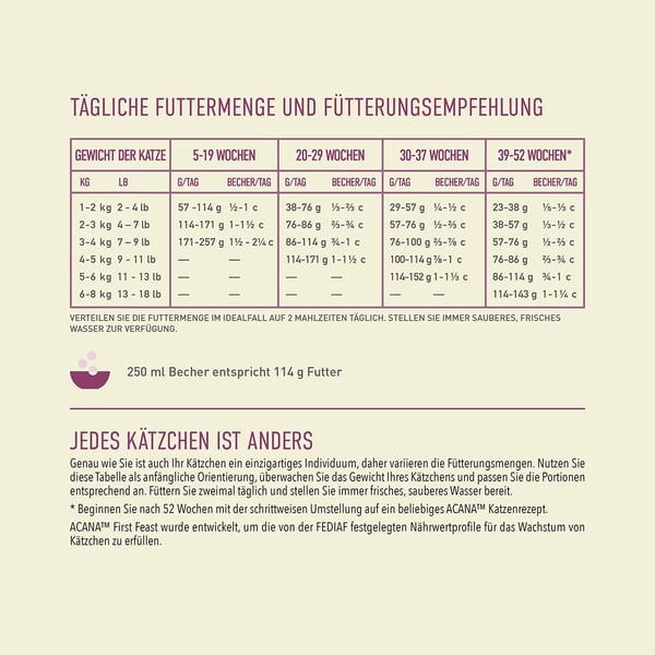 | Gewicht der Katze | 5.-19.Woche | 20.-29. Woche | 30.-37. Woche | 38.-52. Woche |