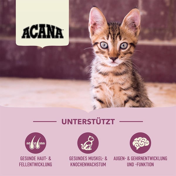 Die natürlichen Zutaten in ACANA Cat First Feast tragen zur Entwicklung von Muskeln und Knochen bei. Omega-3- und Omega-6-Fettsäuren unterstützen die Gesundheit von Haut und Fell, während Taurin, EPA und DHA die Entwicklung von Gehirn und Netzhaut fördern. Diese Kombination aus hochwertigen Zutaten bietet eine umfassende Ernährung, die dein Kätzchen optimal bei seinem Wachstum unterstützt.