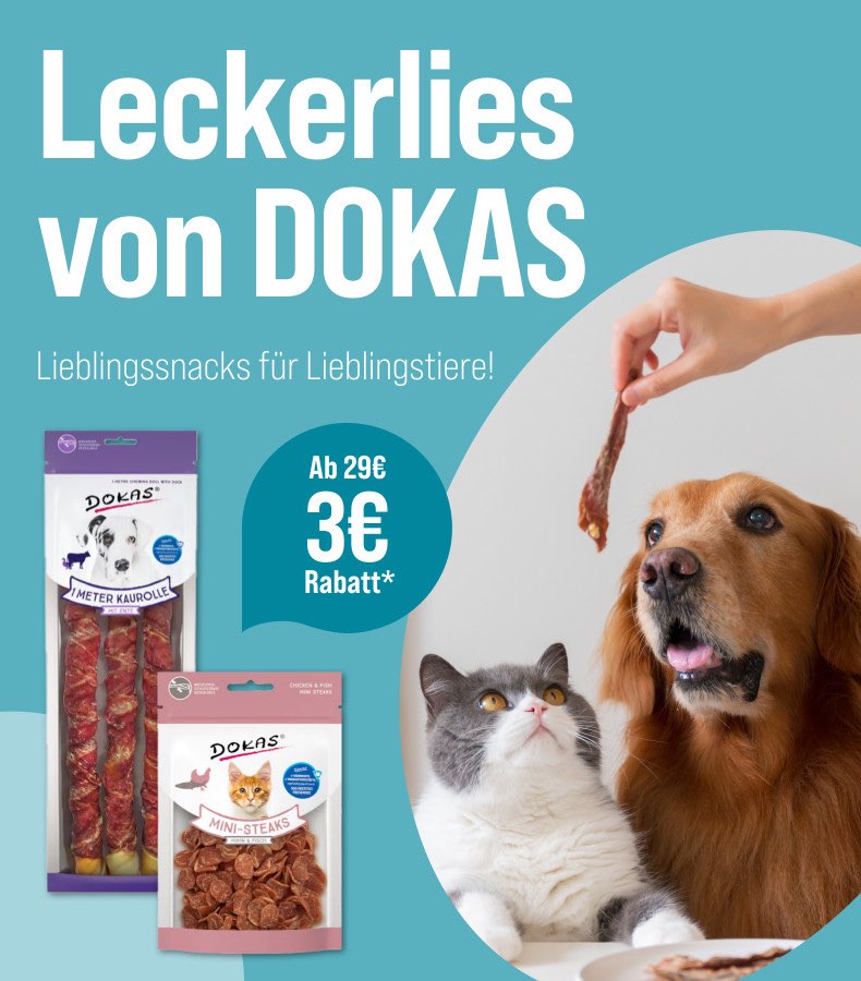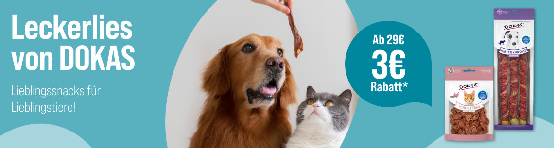 *Gültig vom 09.09.2024 bis 06.10.2024. Das Angebot gilt nur auf ausgewählte Produkte auf unserer Aktionsseite. Nur solange der Vorrat reicht. 3€ Rabatt ab einem Einkaufswert von 29€ mit dem Code Dokas-3. Nur ein Gutscheincode pro Bestellung einlösbar. Gilt nur im ZooRoyal Online-Shop und nicht in den ZooRoyal Fachmärkten.