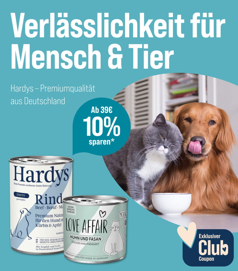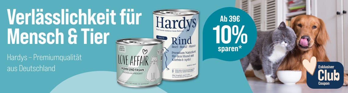*Gültig vom 26.01.2026 bis 22.02.2026 nur für ZooRoyal Club Mitglieder. 10 % Rabatt ab 39 € auf Hardys Futter. Gilt nur auf ausgewählte Produkte dieser Aktionsseite. Gilt nur im ZooRoyal Online-Shop und nicht in den ZooRoyal Fachmärkten.