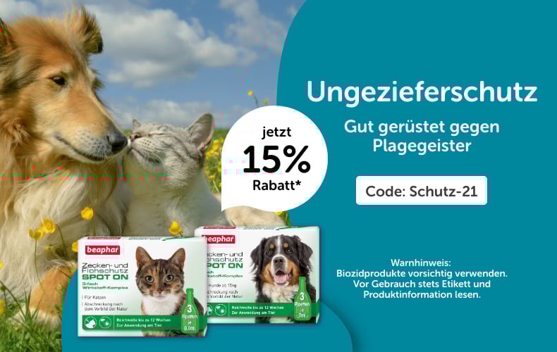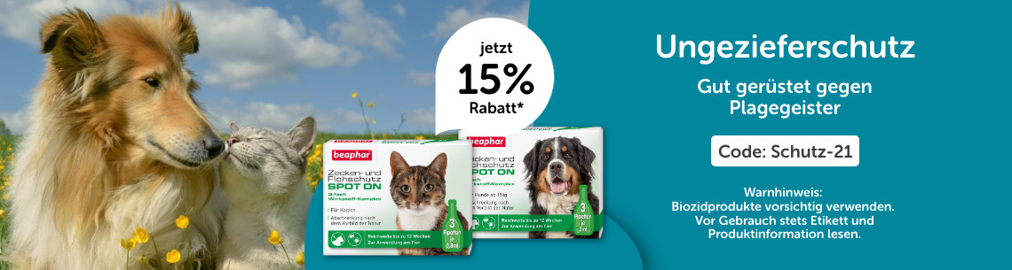 - Erhalte jetzt 15% Rabatt beim Kauf von Produkten zum Ungezieferschutz bei Hunden und Katzen