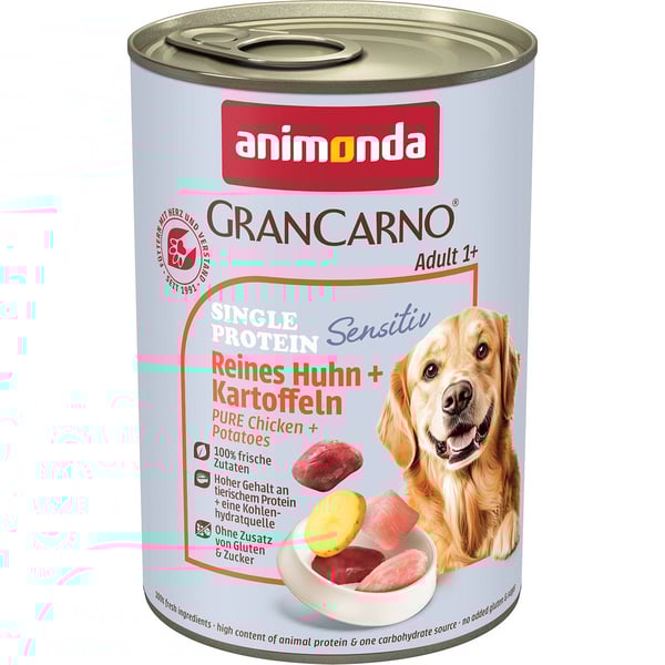 Wenn du ein getreidefreies Nassfutter für deinen Hund suchst, hast du es jetzt gefunden. Animonda Hunde Nassfutter Grancarno Sensitiv Huhn & Kartoffel überzeugt als qualitativ hochwertiges Futter. Für einen guten Appettit sorgt zartes Geflügel. Das Futter ist für Hunde aller Größen zu empfehlen sowie speziell auf die Bedürfnisse von erwachsenen Hunden angepasst. Nur mit genügend Energie kann dein vierbeiniger Liebling fit und aktiv im Alltag sein. Hochwertige Proteine liefert der hohe Fleischanteil. Hunde, die sich viel bewegen, haben einen erhöhten Energiebedarf. Mit diesem proteinreichen Hundefutter erhält dein Hund ausreichend Eiweiß für sein aktives Leben. Außerdem liefert das enthaltene Herz viel hochwertiges Protein. Das Nassfutter ist frei von Gluten und Getreide und ist vor allem für ernährungssensible Hunde mit Allergien oder Unverträglichkeiten zu empfehlen. Um eine gesunde Verdauung zu fördern, können die speziellen Inhaltsstoffe hilfreich sein. Die beigefügten Vitamine können das Immunsystem und die Abwehrkräfte deines Hundes stärken und somit zur Gesundheit des Tieres beitragen. Außerdem wird bewusst auf die Zugabe von Soja, Farbstoffen und Konservierungsmitteln verzichtet. Dieses Nassfutter erfreut sich dank seiner hohen Akzeptanz großer Beliebtheit unter den Vierbeinern.