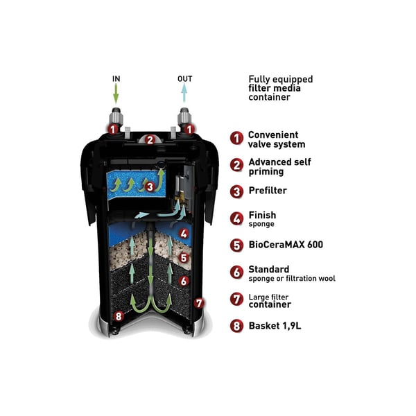 Der Aquaeld Ultramax ist ein technisch hochentwickelter Topffilter mit einem außergewöhnlich ergonomischen Design und patentgeschützten Lösungen, die perfekt sauberes Wasser und entsprechende Wasserparameter in allen, auch anspruchsvollen Aquarien gerantieren, Der integrierte Vorfilter sorgt dafür, dass die Filtereinsätze weniger häufig gereinigt werden müssen und durch seine Unterbringung in der Abdeckung des Filters lässt er sich austauschen, ohne dass der Filter aus dem Schrank genommen werden müsste!