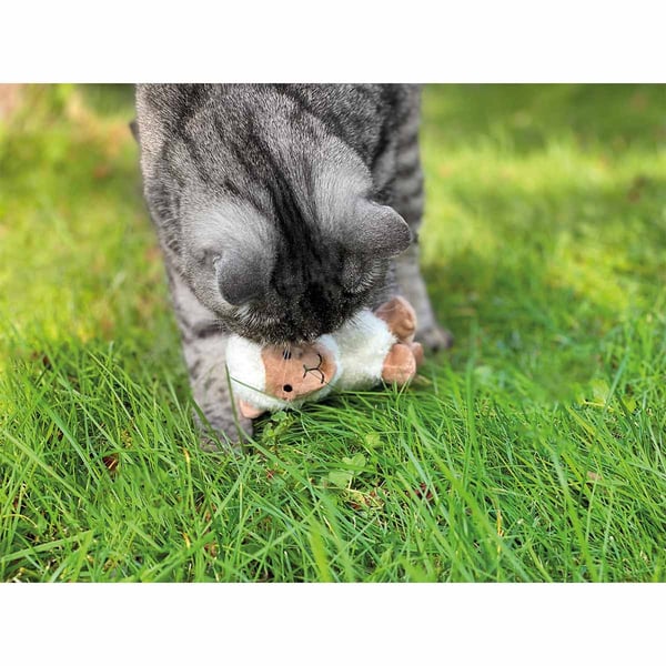 Schäfchen Sally von Aumüller mit dem freundlichen Blick begeistert die Stubentiger mit seinem kuscheligen Plüschfell. Die Füllung aus kontrolliertem Dinkelspelz aus Deutschland raschelt so schön beim Herumtollen und Hineinbeißen. So macht der Katze das Spielen Spaß. Das Highlight für die Katze ist natürlich der unwiderstehliche Duft der Baldrianwurzel. Dieser zieht Katzen magisch an und animiert sie zum Spielen. Auch ein Hineinbeißen ist bei diesen hochwertigen Materialien kein Problem.