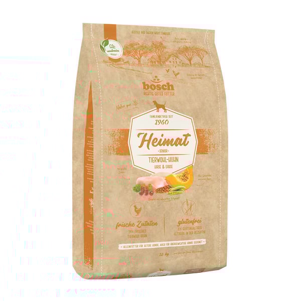 Das Heimat Senior Trockenfutter mit frischem Tierwohl-Huhn (24%) wird schonend und liebevoll für Deinen Hundesenior in dem traditionsreichen Familienunternehmen in Wiesenbach hergestellt.