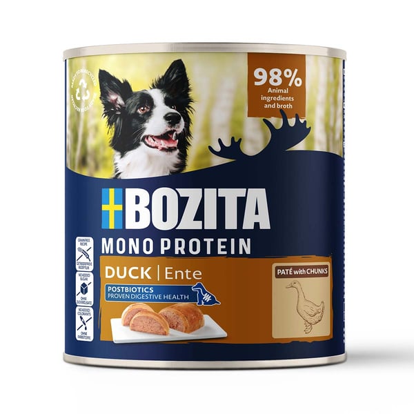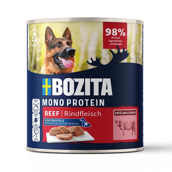 Bozita Paté ist ein Alleinfuttermittel, das aus einer tierischen Proteinquelle hergestellt wird. Dies sorgt für eine leicht verdauliche Ernährung, die besonders sicher für Hunde mit empfindlichem Magen ist. Die Rezeptur ohne Farbstoffe und mit einem hohen Fleischanteil bietet deinem Hund eine ausgewogene und nahrhafte Mahlzeit, die er lieben wird.