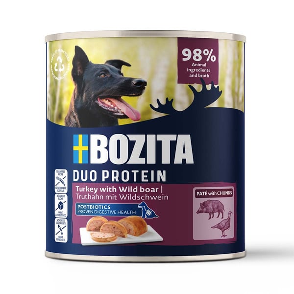 Bozita Paté für Hunde bietet eine sorgfältig ausgewählte Zusammensetzung aus Rind, Ente, Pute und Wildschwein. Mit einem hohen Anteil an tierischen Zutaten und Brühe von 98 % wird deinem Hund eine schmackhafte und nahrhafte Mahlzeit geboten. Die Rezeptur ist getreidefrei und ohne Zuckerzusatz, was sie besonders geeignet für Hunde mit empfindlichem Magen macht.