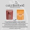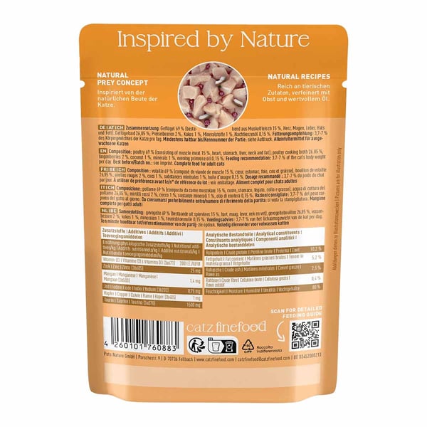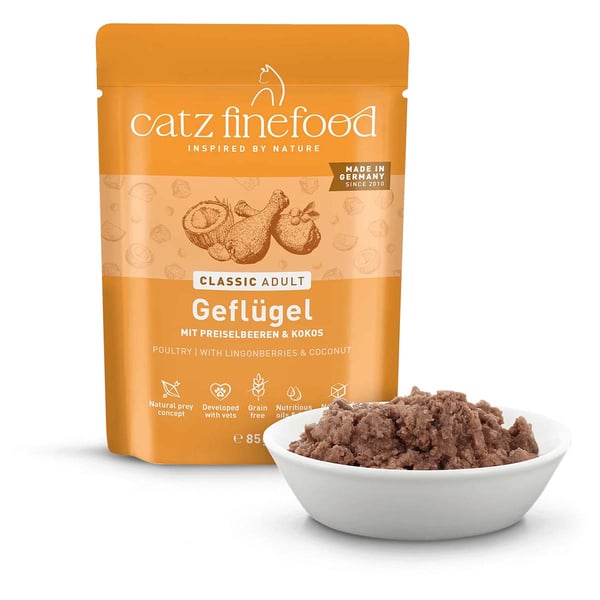 catz finefood besteht zum Großteil aus wertvollem Hähnchenfleisch. Dieses enthält wenig Fett und ist leicht verdaulich, was besonders bei Katzen mit Ernährungsproblemen von Vorteil ist. Außerdem besitzt es viele ungesättigte Fettsäuren, die wichtig für Fell und Haut sind. Preiselbeeren und Löwenzahn sind ebenfalls Bestandteil des Futters: Sei liefern wichtige Mineralstoffe und Vitamine.