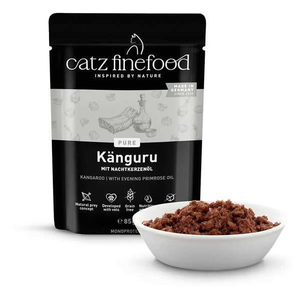 catz finefood Pure Känguru 16x85g bietet deiner Katze ein getreidefreies Nassfutter mit Mono-Protein. Zartes Känguru sorgt für einen unwiderstehlichen Geschmack, den deine Katze lieben wird. Das Futter ist speziell auf die Bedürfnisse von ausgewachsenen Katzen angepasst und eignet sich für Katzen aller Größen. Mit diesem Futter bekommt deine Katze alles, was sie für ein aktives Leben benötigt.