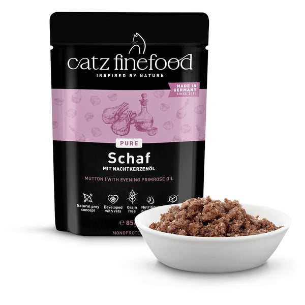 catz finefood Pure Schaf 16x85g bietet deiner Katze ein getreidefreies Nassfutter mit Mono-Protein. Zartes Schaf sorgt für einen unwiderstehlichen Geschmack, den deine Katze lieben wird. Das Futter ist speziell auf die Bedürfnisse von ausgewachsenen Katzen angepasst und eignet sich für Katzen aller Größen. Mit diesem Futter bekommt deine Katze alles, was sie für ein aktives Leben benötigt.
