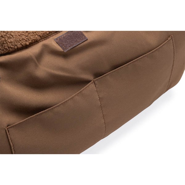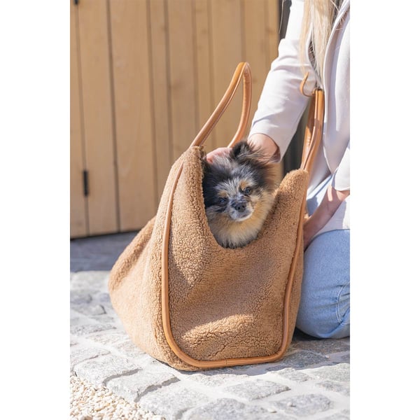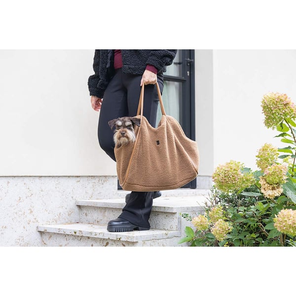 Die Designed by Lotte Transporttasche Tebby bietet dir eine elegante Möglichkeit, deinen kleinen Hund sicher und bequem zu transportieren. Mit ihrem modischen Design in der Farbe Cognac und dem weichen Teddystoff zieht sie alle Blicke auf sich. Diese Tasche ist ideal für Hunde, die schnell müde werden oder nicht in der Lage sind, lange Strecken zu laufen. Dank ihrer kompakten Maße von 43 x 15 x 35 cm ist sie perfekt für unterwegs geeignet.