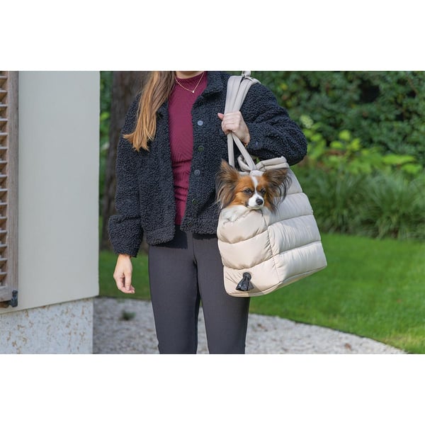 Die Designed by Lotte Transporttasche Tico bietet eine stilvolle Lösung, um deinen kleinen Hund bequem zu transportieren. Mit ihrem eleganten Design passt sie perfekt zu jedem Outfit und bietet gleichzeitig hohen Komfort für deinen Vierbeiner. Die Tasche ist ideal für kurze Ausflüge oder längere Reisen, bei denen du deinen Hund sicher und bequem mitnehmen möchtest.