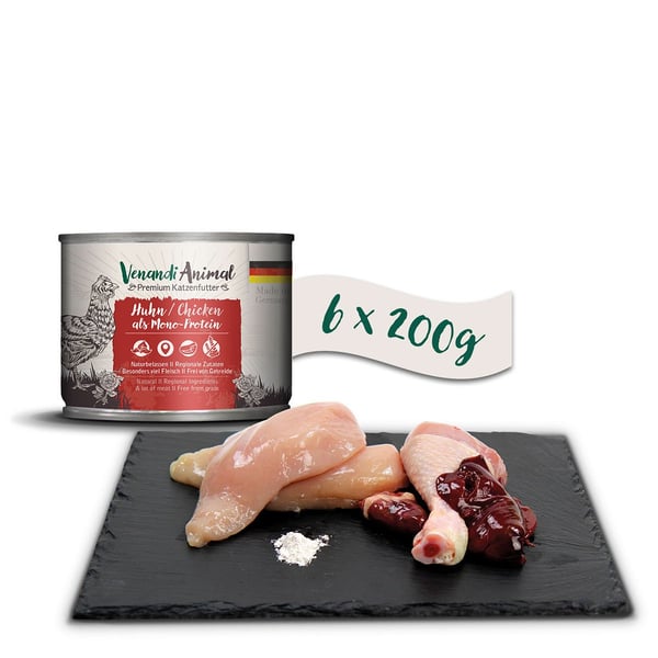 Venandi Nassfutter mit Huhn versorgt Ihre Katze mit allen wichtigen Nährstoffen und ist durch seine natürlichen und delikaten Zutaten äußerst schmackhaft. Der hohe Fleischanteil jedes Menüs stammt aus einer Proteinquelle, was selbst bei Katzen mit empfindlicher Verdauung zu einer sehr hohen Verträglichkeit führt. Neben frischem Muskelfleisch sind nahrhafte Innereien enthalten, die auf natürliche Weise den Bedarf an Vitaminen und Mineralstoffen decken.