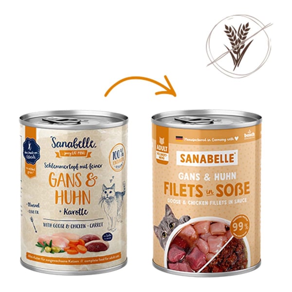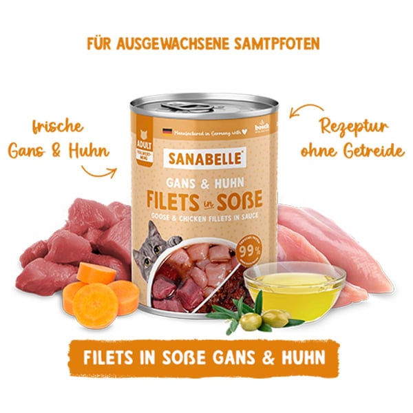 Sanabelle Adult mit feiner Gans + Huhn mit Karotte + Olivenöl ist ein Alleinfutter für ausgewachsene Katzen in All-Meat Qualität in feiner Soße.