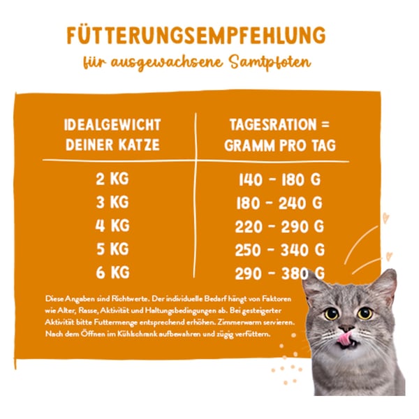 Idealgewicht der ausgewachsenen Katze / Gramm pro Tag