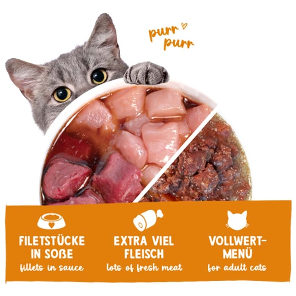 Das Menü für Feinschmecker wird ohne Getreide hergestellt und mit ausgewähltem Gemüse verfeinert. Es enthält neben frischer Gans (5 %) weiterhin frisches Huhn (47 %) sowie wertvolle frische Innereien (15 %, davon 3 % frische Leber). Karotten liefern wertvolle Kohlenhydrate und Vitamine, die Extra Portion Olivenöl sorgt für eine gute Versorgung der Katze mit essentiellen, ungesättigten Fettsäuren für Haut und Fell.