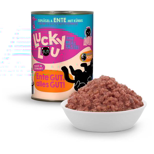 Ihr seht also: Mein Futter gibt es speziell auf unsere verschiedenen Lebensabschnitte und individuellen Bedürfnisse abgestimmt. Langweiligen Einheitsfraß gibt’s woanders – Lucky Lou Lifestage ist in 18 verschiedenen Sorten erhältlich. Damit du deinen Katzen immer frisches Futter servieren kannst, gibt es Lucky Lou Lifestage in Pouchbeuteln mit 125 g Inhalt sowie in Dosen zu 200 g und 400 g. Und Multipacks gibt’s natürlich auch!