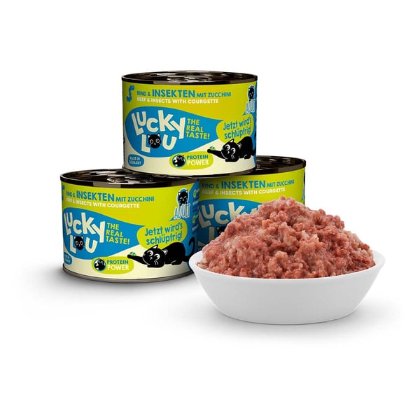 Rind 65 % (bestehend aus Herz, Muskelfleisch, Leber und Lunge), Rinder- und Insektensud 26,8 %, Insekten 5 %, Zucchini 2 %, Mineralstoffe 1 %, Borretschöl 0,2 %