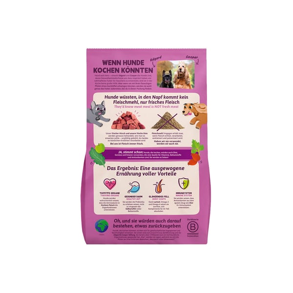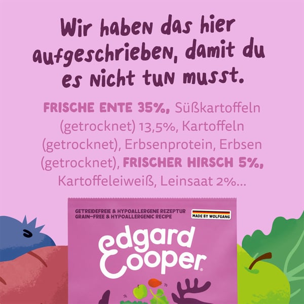 Edgard & Cooper Hirsch & Freilaufente bietet eine natürliche Ernährung mit viel frischem Fleisch aus artgerechter Haltung. Die Rezeptur ist hypoallergen und getreidefrei, was sie ideal für Hunde mit empfindlichen Mägen macht. Die Kombination aus Wild und Freilandente liefert hochwertiges Protein aus neuartigen Quellen.