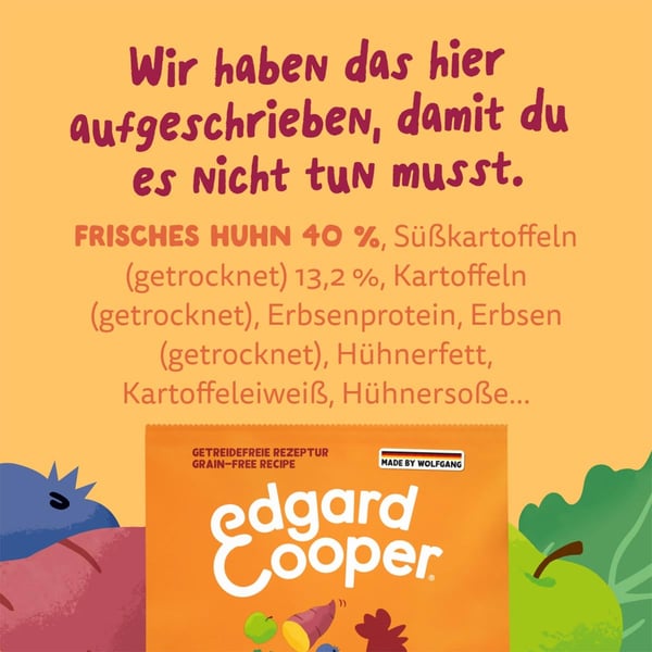 frisches Huhn* 40%, Süßkartoffeln* (getrocknet) 13,2%, Kartoffeln* (getrocknet), Erbsenprotein*, Erbsen* (getrocknet), Hühnerfett*, Kartoffeleiweiß, Hühnersoße, Leinsaat* 2%, Rübentrockenschnitzel*, Mineralstoffe*, Hefen* (getrocknet) 1,2%, Tomatenpülpe*, Zichorien* (getrocknet) 0,5%, Lachsöl* 0,4%, Kürbis* (getrocknet) 0,2%, Grünkohl* (getrocknet) 0,2%, Blaubeeren* (getrocknet) 0,05%, Apfel* (getrocknet) 0,05%, Petersilie* (getrocknet) 0,02%, Hagebutte* (getrocknet) 0,02%, Glucosamin 0,02%, Chondroitinsulfat* 0,02%. *Natürlich