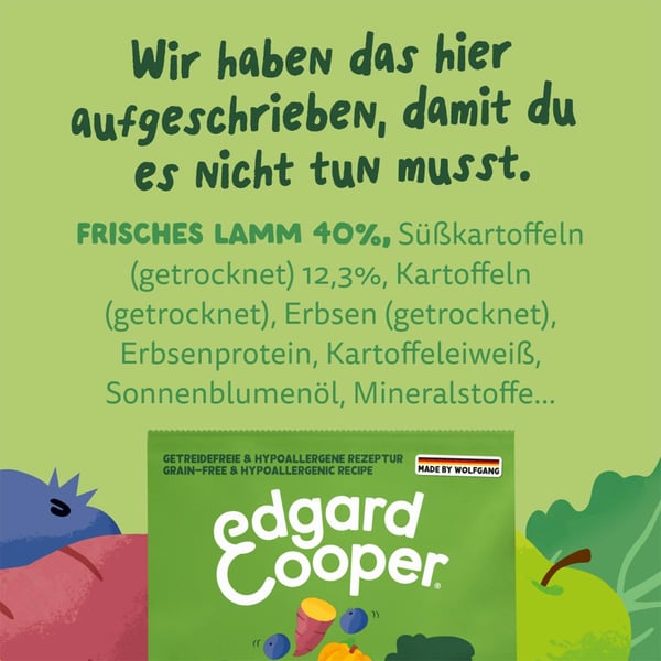 frisches Lamm* 40%, Süßkartoffeln* (getrocknet) 12,3%, Kartoffeln* (getrocknet), Erbsen* (getrocknet), Erbsenprotein*, Kartoffeleiweiß, Sonnenblumenöl*, Mineralstoffe*, Leinsaat* 2%, Rübentrockenschnitzel*, Lammsoße, Tomatenpülpe*, Hefen* (getrocknet) 1%, Lachsöl* 1%, Zichorien* (getrocknet) 0,5%, Kürbis* (getrocknet) 0,2%, Grünkohl* (getrocknet) 0,2%, Blaubeeren* (getrocknet) 0,05%, Apfel* (getrocknet) 0,05%, Petersilie* (getrocknet) 0,02%, Hagebutte* (getrocknet) 0,02%, Glucosamin 0,02%, Chondroitinsulfat* 0,02%. *Natürlich
