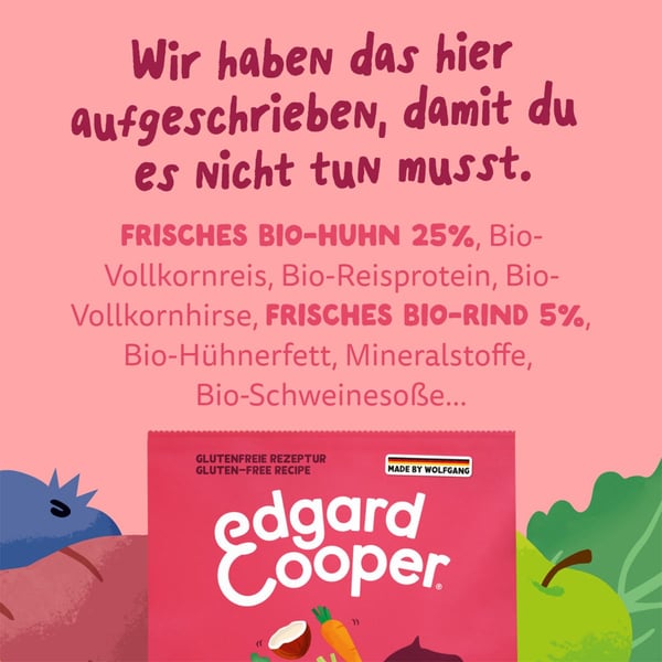 *Zu 100 % aus kontrolliert ökologischer Landwirtschaft. Frisches Bio-Huhn* 25 %, Bio-Vollkornreis*, Bio-Reisprotein*, Bio-Vollkornhirse*, frisches Bio-Rind* 5 %, Bio-Hühnerfett*, Bio-Schweinesoße*, Mineralstoffe, Bio-Tomaten* 0,04 %, Bio-Karotten* 0,04 %, Bio-Rote-Bete* 0,04 %, Bio-Grünkohl* 0,04 %, Bio-Kokosnuss* 0,04 %, Bio-Nesseln*, Bio-Brombeerblätter*, Bio-Fenchel*, Bio-Kümmel*, Bio-Kamille*, Bio-Melisse*.