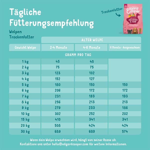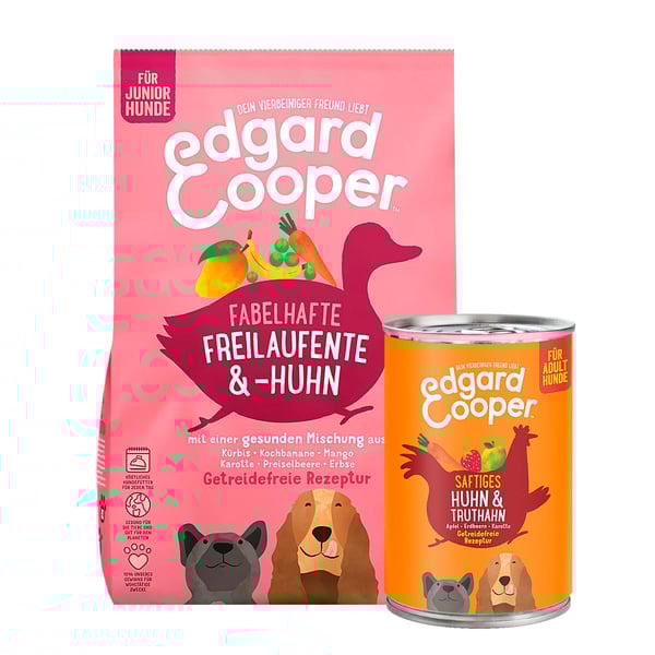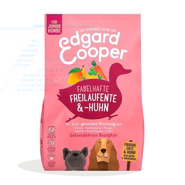 Reich an frischer Ente und Huhn aus Freilaufhaltung, ist diese getreidefreie Spezialität perfekt auf die Bedürfnisse von Welpen ausgerichtet. Edgard & Cooper Junior Freilaufente & Huhn ist voll an hochwertigem, kalorienarmen Protein - das bedeutet kein getrocknetes oder entwässertes Fleisch. Dieses Futter enthält Präbiotika für einen gesunden Darm und wir fügen natürliche Extrakte von Glucosamin und Chondroitin für starke Gelenke hinzu. Wir bereiten unser Trockenfutter mit einem super gesunden Mix aus Obst und Gemüse sowie einer extra Portion Kräuter zu. Dann wird es schonend gegart, um all das Gute und den Geschmack zu erhalten. Hergestellt in Deutschland.