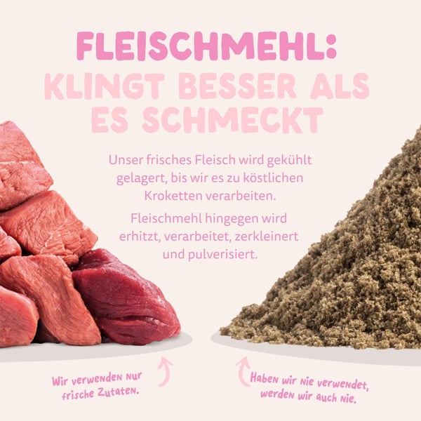 Die Nahrung enthält natürliche Extrakte von Glucosamin und Chondroitin, die zur Unterstützung starker Gelenke beitragen. Präbiotika fördern einen funktionierenden Darm, was für die Entwicklung deines Welpen wichtig ist. Die schonende Zubereitung bewahrt die wertvollen Inhaltsstoffe und den natürlichen Geschmack des Futters.