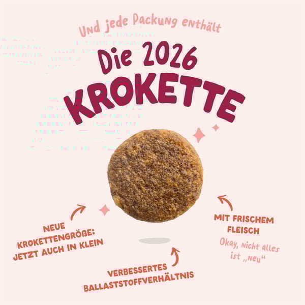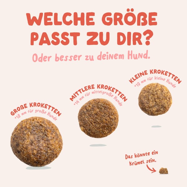Edgard & Cooper Trockenfutter ist in verschiedenen Krokettengrößen erhältlich. Krokettengröße S – ideal für kleine Hunde und Mini-Rassen (unter 10 kg). Krokettengröße M – ideal geeignet für mittelgroße Hunde (ca. 10 - 25 kg). Krokettengröße L – optimal für große Hunde (ab ca. 25 kg) und kräftige Kauer. Beachte bei der Auswahl bitte die Größe und Vorliebe deines Tieres.