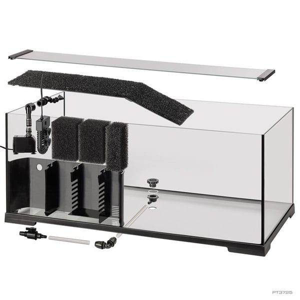 Lieferumfang: Glasterrarium mit integriertem Filtersystem und Heizer.