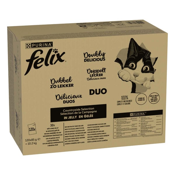 FELIX Doppelt Lecker ist eine Auswahl unwiderstehlicher Mahlzeiten, die so lecker aussehen, riechen und schmecken, als hätte man sie selbst zubereitet. Jede Sorte, hergestellt mit hochwertigen Zutaten, besteht aus zarten Stücken, die zwei verschiedene Geschmacksrichtungen in Gelee kombinieren, sodass sich Ihr Racker gleich zwei seiner Lieblingssorten in einer leckeren Portion schmecken lassen kann! Sie schmecken wirklich doppelt lecker! Unser FELIX Nassfutter für Katzen ist einfach unwiderstehlich!