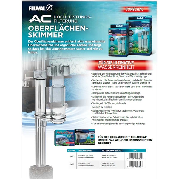 Die Montage des Oberflächenskimmers ist unkompliziert und schnell erledigt. Er ist kompatibel mit den Fluval AquaClear Hochleistungsfiltern AC70 und AC110, was ihn zu einer vielseitigen Ergänzung für dein Aquarium macht. Der Filter selbst ist nicht im Lieferumfang enthalten.