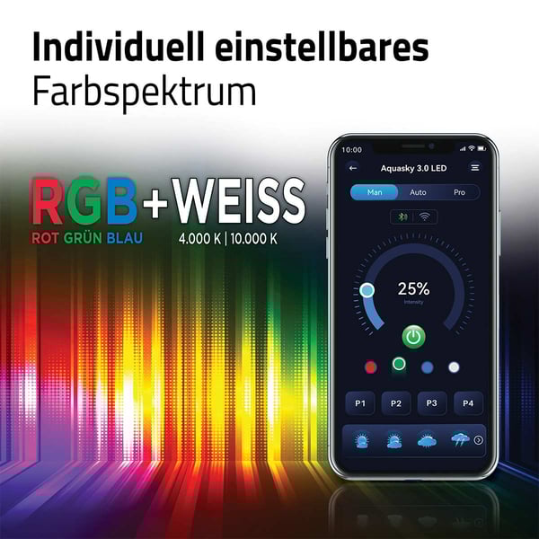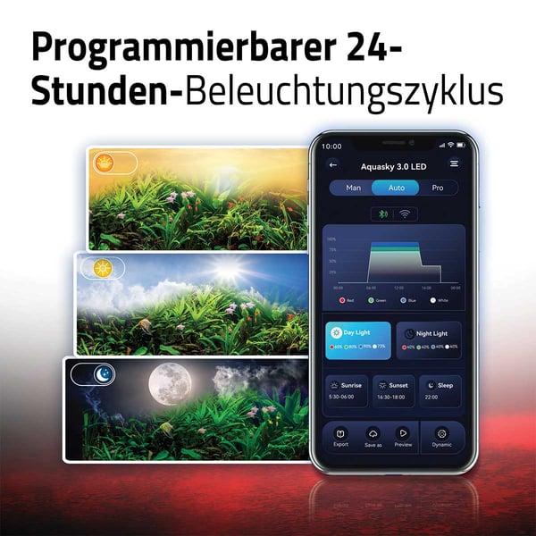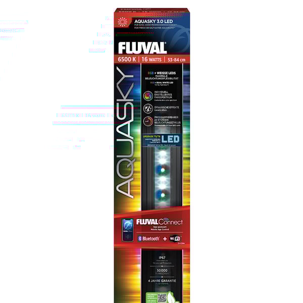 Die Fluval AquaSky LED 3.0 bietet dir eine vollständig anpassbare Beleuchtung, die das natürliche Sonnenlicht imitiert. Mit RGB + doppelt so vielen weißen LEDs kannst du das Farbspektrum nach deinen Wünschen einstellen. Die programmierbaren Beleuchtungszyklen lassen deinen Aquarienbewohnern einen natürlichen Tagesablauf erleben.