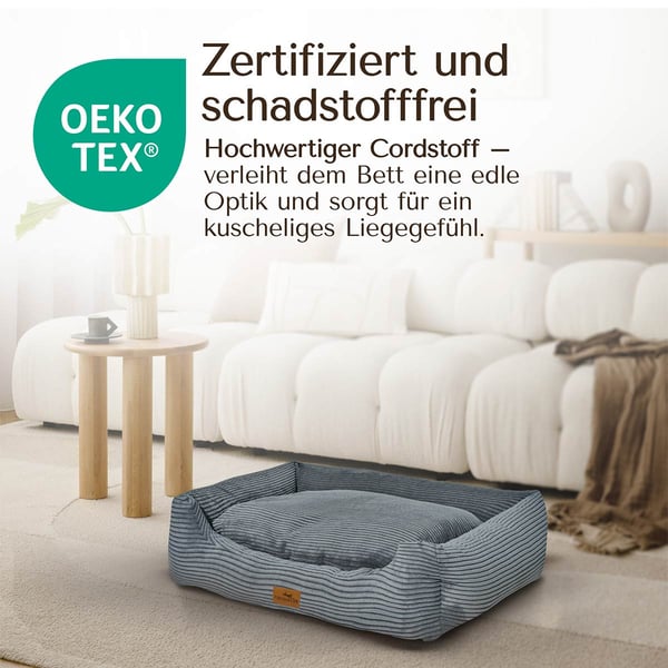 Der Bezug des Hundebetts besteht aus weichem, strukturiertem Cordstoff, der nicht nur stilvoll aussieht, sondern auch zum Reinkuscheln einlädt. Der abziehbare Bezug kann problemlos bei 30 Grad in der Waschmaschine gewaschen werden, was das Bett besonders pflegeleicht macht. So bleibt der Ruheplatz deines Hundes stets sauber und hygienisch, ohne dass du großen Aufwand betreiben musst.