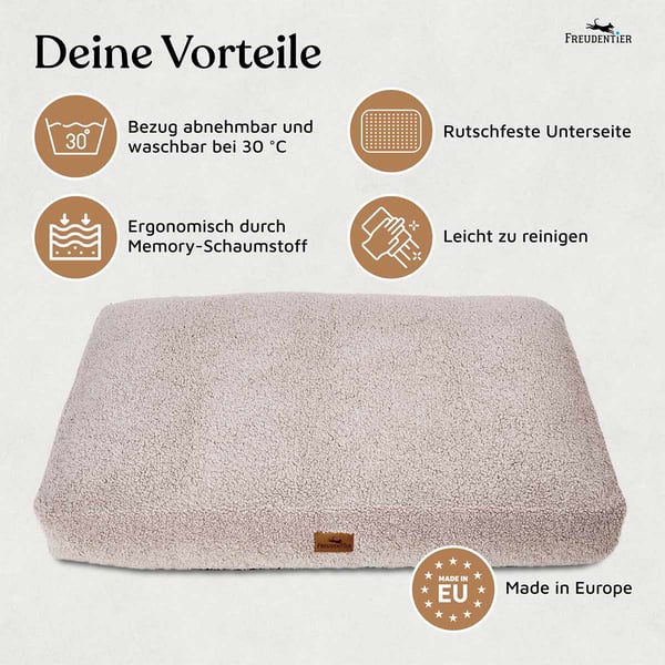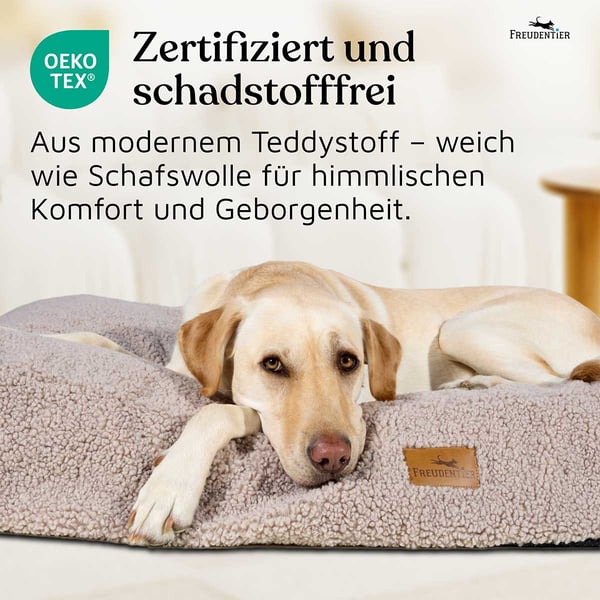 Das Freudentier orthopädische Hundekissen aus Teddy bietet deinem Hund eine unvergleichliche Kombination aus Komfort und Geborgenheit. Die druckentlastenden Eigenschaften des Memory Foams passen sich optimal an den Körper deines Hundes an und sorgen für einen erholsamen Schlaf. Der kuschelige OEKO-TEX Teddystoff lädt zum Einkuscheln ein und schafft eine wohlig warme Umgebung, in der sich dein Hund sicher und geborgen fühlt. So wird jeder Schlaf zu einem entspannenden Erlebnis.