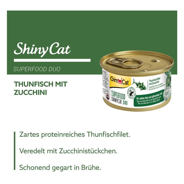 GimCat Superfood ShinyCat Duo Thunfischfilet mit Zucchini bietet deiner Katze ein Nassfutter, das speziell auf die Bedürfnisse von erwachsenen Katzen abgestimmt ist. Der hohe Fleischanteil liefert wertvolle Proteine, die deinem Vierbeiner Energie für den Tag geben. Die Kombination aus Thunfisch und Zucchini sorgt nicht nur für einen guten Appetit, sondern auch für eine ausgewogene Ernährung.