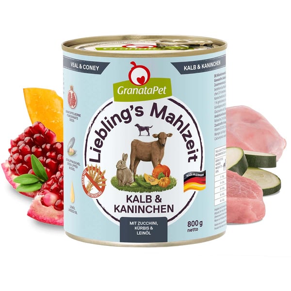 GranataPet Liebling's Mahlzeit Kalb und Kaninchen bietet deinem Hund ein hochwertiges Nassfutter, das speziell auf die Bedürfnisse von jungen, erwachsenen und Senior-Hunden abgestimmt ist. Mit einem hohen Fleischanteil von 68% und leckeren Innereien sorgt dieses Futter für eine ausgewogene Ernährung. Es ist frei von Konservierungsmitteln und bietet deinem Vierbeiner eine natürliche und nahrhafte Mahlzeit.