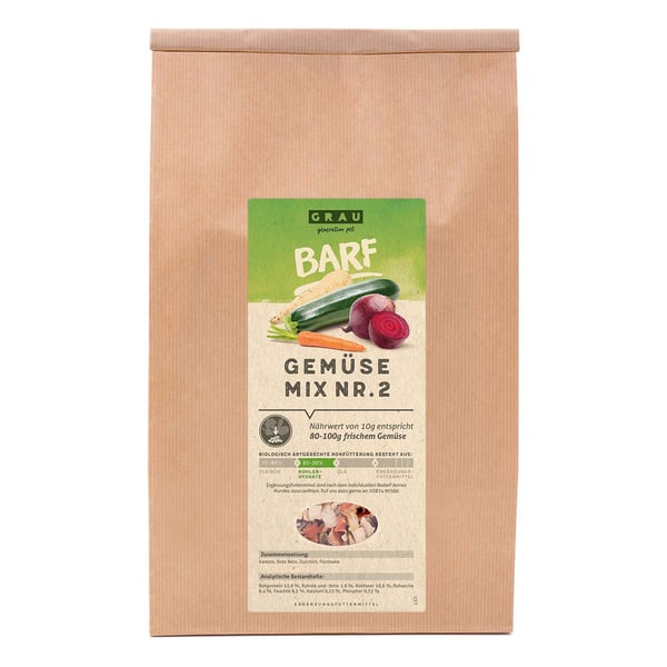 Mit Grau Gemüsemix Mischung Nr. 2 suchst du dir hervorragenden Futterzusatz aus. Naturbelassene Bestandteile machen die Zutaten von Grau aus. Die Nahrungsergänzung ist für Hunde aller Lebensphasen geeignet.