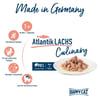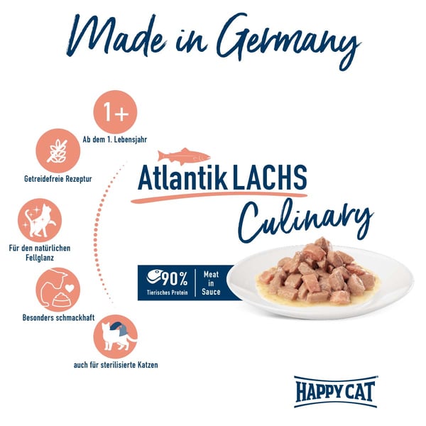Happy Cat Meat in Sauce Atlantik-Lachs verwöhnt ausgewachsene Gourmets mit zartem Lachs an feiner Soße und liefert alles für ein vitales Katzenleben. Die schmackhafte und getreidefreie Rezeptur unterstützt den natürlichen Fellglanz und ist auch für sterilisierte Katzen geeignet. Die Rezeptur ist genau auf die Bedürfnisse ausgewachsener Katzen abgestimmt. Auf Basis des Happy Cat Natural Life Concept® haben die Ernährungsexperten eine spezielle Vitalitätsformel entwickelt, die auf natürliche Art und Weise die fünf wichtigsten Bedürfnisse einer Katze abdeckt. Ernährungsphysiologisch bestätigt sorgt es für eine geregelte Verdauung, unterstützt das Immunsystem, den Harntrakt, die Herzgesundheit und ist gut für Haut & Fell.