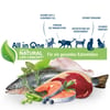 Fleisch und Innereien (u.a. 20 % Geflügel), Fisch und Fischnebenerzeugnisse (10 % Lachs), pflanzliche Nebenerzeugnisse (u.a. 0,3 % Apfelfaser), Mineralstoffe, Saaten (u.a. 0,03 % Leinsamen), Inulin (0,1 %);