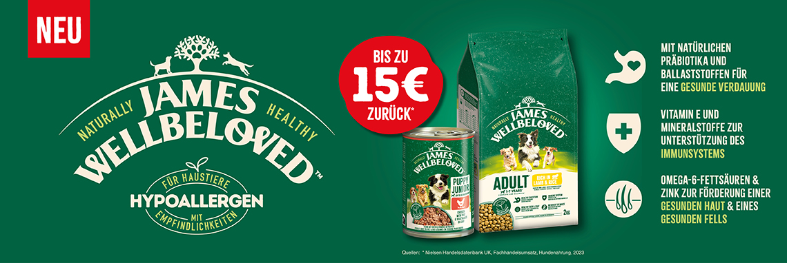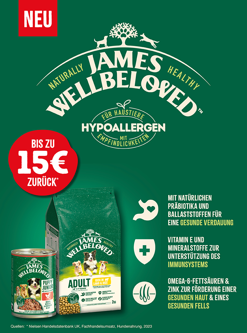 James Wellbeloved™ unterstützt die Gesundheit deines Haustieres auf natürliche Weise mit sorgfältig ausgewählten, natürlichen Inhaltsstoffen. Jedes Rezept wird mit einer einzigen Proteinquelle formuliert, um optimale Ernährung zu gewährleisten – die ideale Wahl für Haustiere mit Haut- oder Verdauungsproblemen.