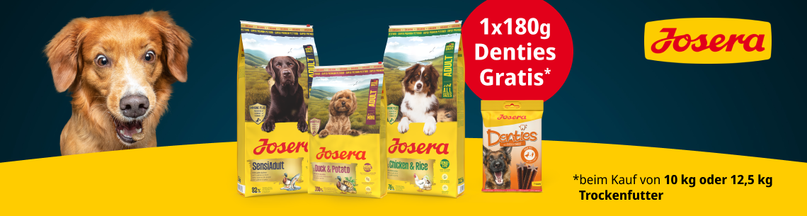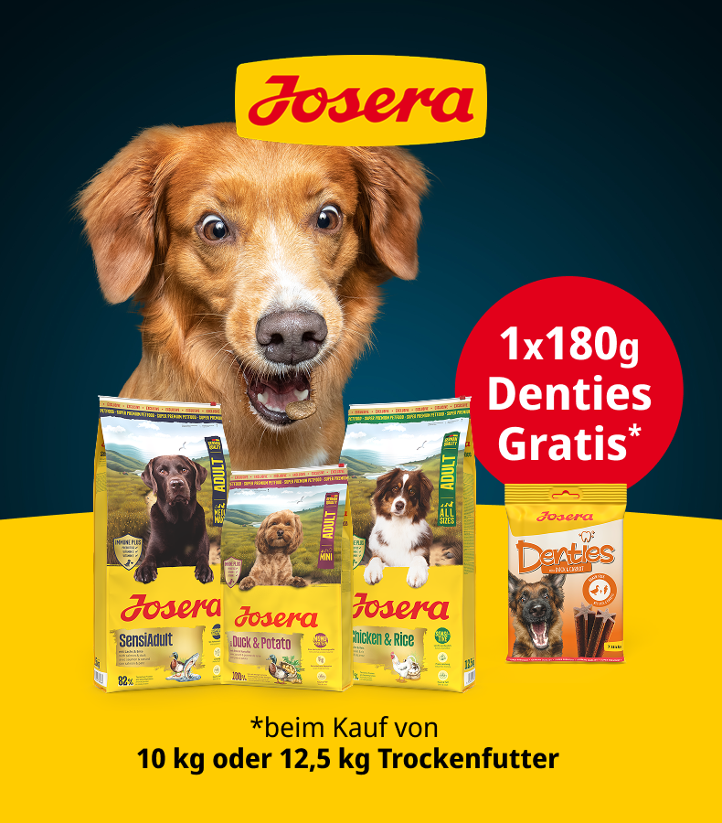 *Gültig vom 11.11.2025 bis 20.11.2025. Kaufe ein Josera Großgebinde und erhalte Josera Denties Duck & Carrot Kaustangen gratis mit dem Code Jos-Dent. Gilt nur auf ausgewählte Produkte dieser Aktionsseite. Gilt nur im ZooRoyal Online-Shop und nicht in den ZooRoyal Fachmärkten.
