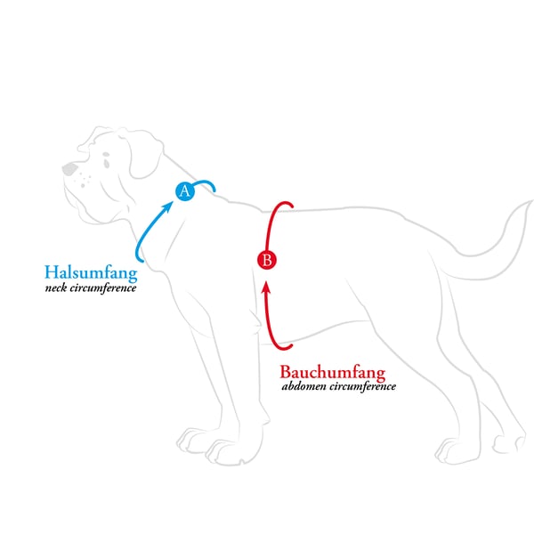 Idealerweise misst du den Bauchumfang (B) des Hundes knapp hinter den Vorderläufen an der breitesten Stelle des Brustkorbes mit einem flexiblen Maßband. Das Maßband sollte eng anliegen, den Hund aber nicht beengen. Etwa eine Fingerbreite Luft sollte zwischen Maßband und Hund bleiben. Anhand dieses Umfangs und der Berücksichtigung des Halsumfangs (A) kann die korrekte Geschirr-Größe ermittelt werden. In der Regel sind alle Geschirre mindestens am Bauch, meist aber auch mehrfach verstellbar und können zugunsten des Tragekomforts optimal an jede Körperform angepasst werden.