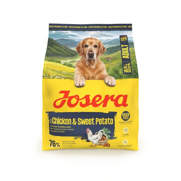 Josera Medi/Maxi Chicken & Sweet Potato ist das gut verträgliche, kartoffelfreie Hundefutter für aktive Vierbeiner mittlerer und großer Rassen. Die getreidefreie Rezeptur mit Süßkartoffel und leckerem Huhn sowie diätetischen Fasern zeichnet sich durch ihre besonders gute Verdaulichkeit aus. Vitamin E und L-Carnitin liefern aktiven Naturliebhabern auf vier Pfoten ein Plus an Energie.