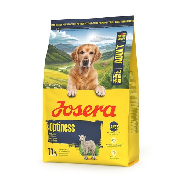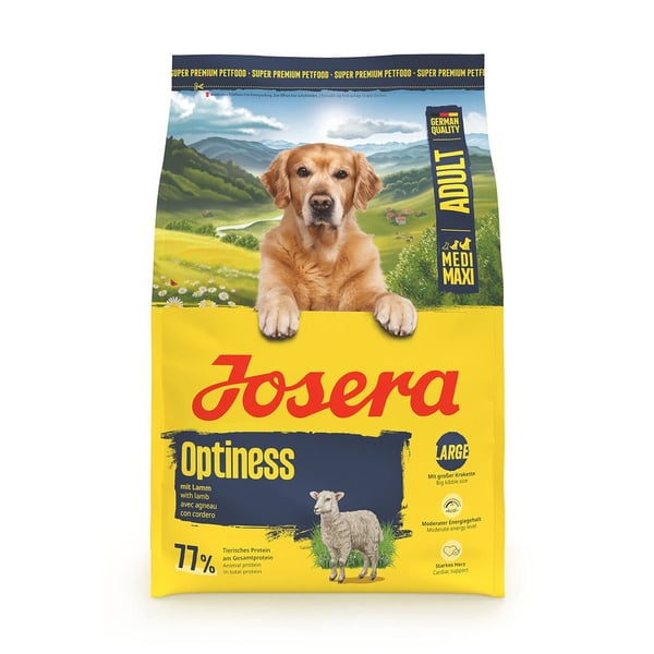 Große Pfoten und viel Anspruch? Wählerische, große Hunde werden Josera Optiness lieben – und außerdem mit allem versorgt, was sie brauchen. Das Hundefutter mit besonders gut verträglichem Lamm und Reis ist eine schonende Kost ohne Weizen, Soja und Mais. Dank des moderaten Energiegehalts ist es perfekt auf die Bedürfnisse normal aktiver, größerer Hunde zugeschnitten.