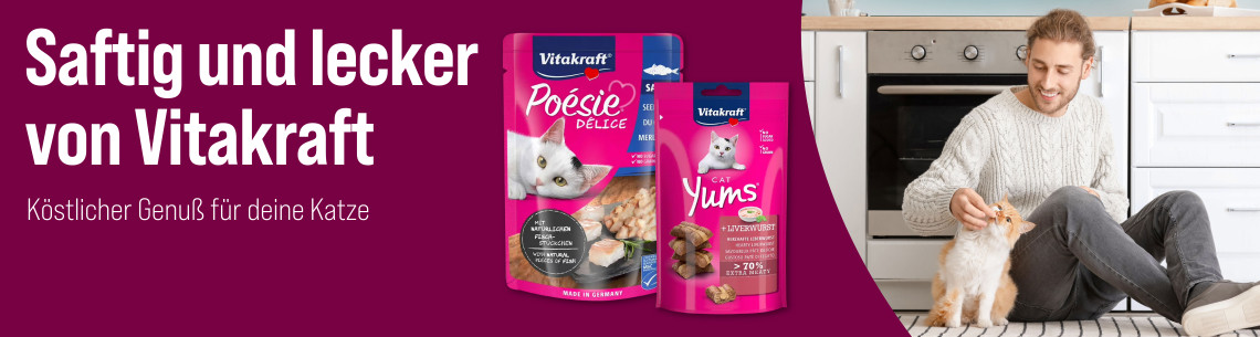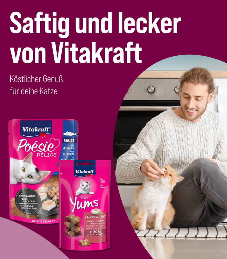 - 13 %VitakraftVitakraft Katzensnack Cat Yums Leberwurst3 Stück + 1 Variante4,9 UVP € 5,07 (-13.41%)€ 4,39€ 32,52 / kgSchließenSchließen