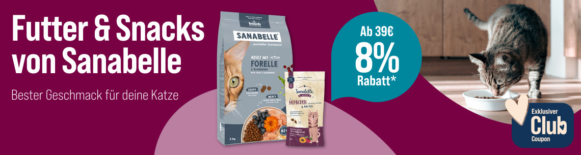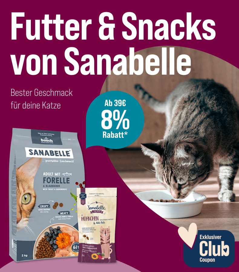 *Gültig vom 26.01.2026 bis 22.02.2026 nur für ZooRoyal Club Mitglieder. Spare 8 % ab 39 € Einkaufswert auf Sanabelle Katzenfutter. Gilt nur auf ausgewählte Produkte dieser Aktionsseite. Gilt nur im ZooRoyal Online-Shop und nicht in den ZooRoyal Fachmärkten.