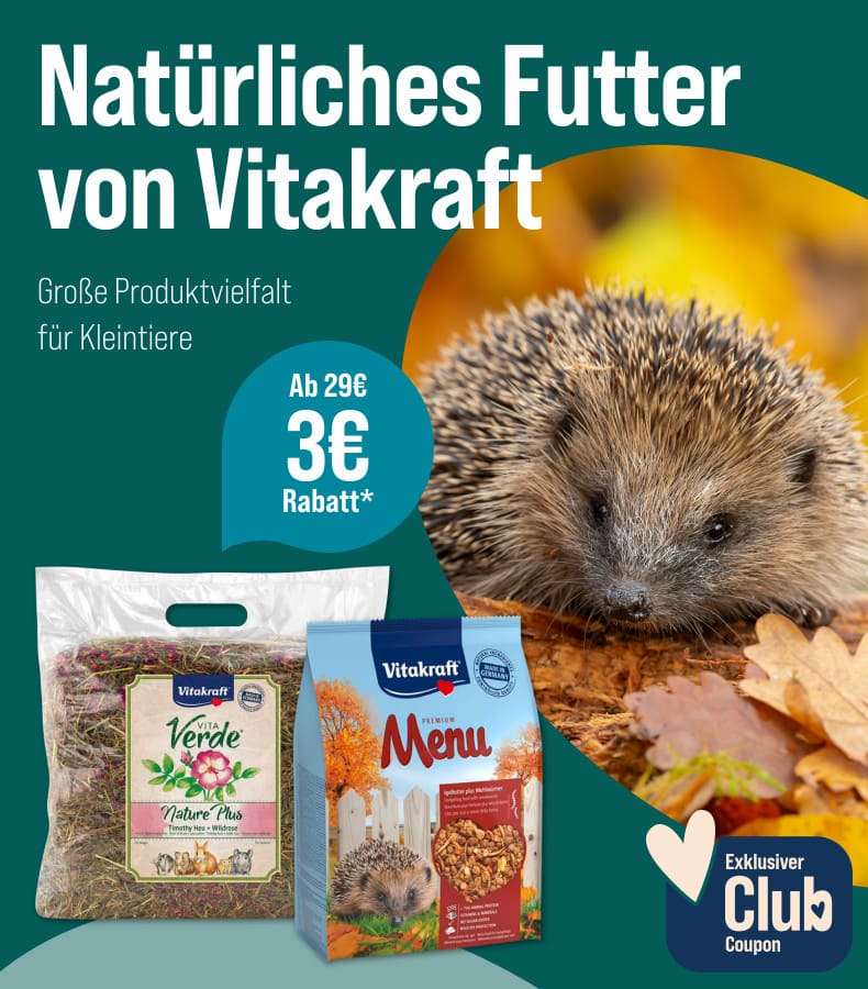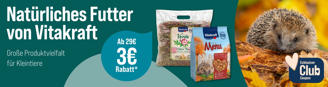 *Gültig vom 01.12.2025 bis 28.12.2025 nur für ZooRoyal Club Mitglieder. Spare 3 € ab 29 € auf Vitakraft Kleintierfutter. Gilt nur auf ausgewählte Produkte dieser Aktionsseite. Gilt nur im ZooRoyal Online-Shop und nicht in den ZooRoyal Fachmärkten.