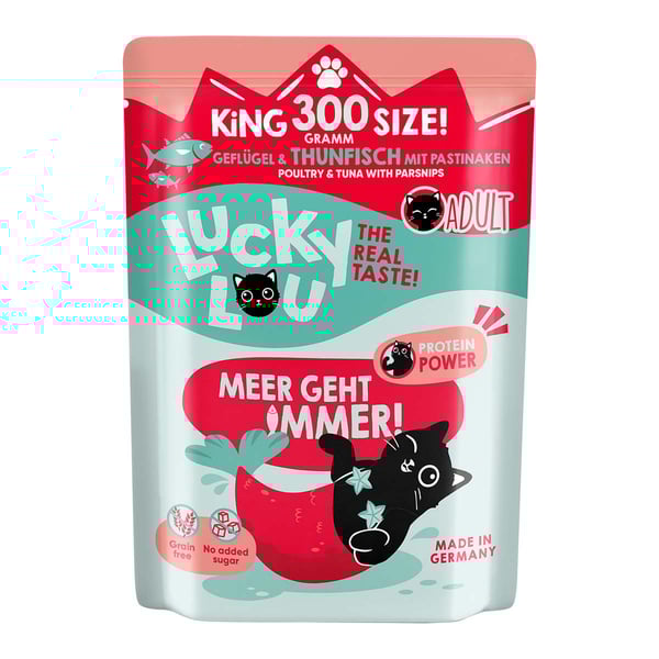 Langweiligen Einheitsfraß gibt’s woanders – Lucky Lou Lifestage ist in 18 verschiedenen Sorten erhältlich. Damit du deinen Katzen immer frisches Futter servieren kannst, gibt es Lucky Lou Lifestage in Pouchbeuteln mit 125 g Inhalt sowie in Dosen zu 200 g und 400 g. Und Multipacks gibt’s natürlich auch!