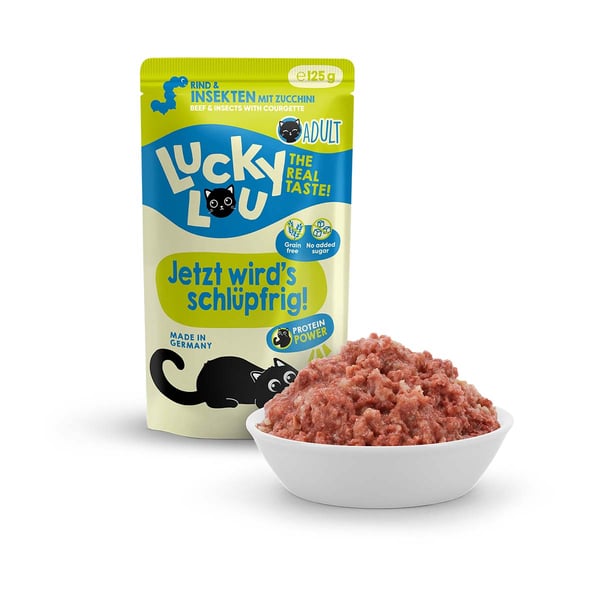 Ihr seht also: Mein Futter gibt es speziell auf unsere verschiedenen Lebensabschnitte und individuellen Bedürfnisse abgestimmt. Langweiligen Einheitsfraß gibt’s woanders – Lucky Lou Lifestage ist in 18 verschiedenen Sorten erhältlich. Damit du deinen Katzen immer frisches Futter servieren kannst, gibt es Lucky Lou Lifestage in Pouchbeuteln mit 125 g Inhalt sowie in Dosen zu 200 g und 400 g. Und Multipacks gibt’s natürlich auch!